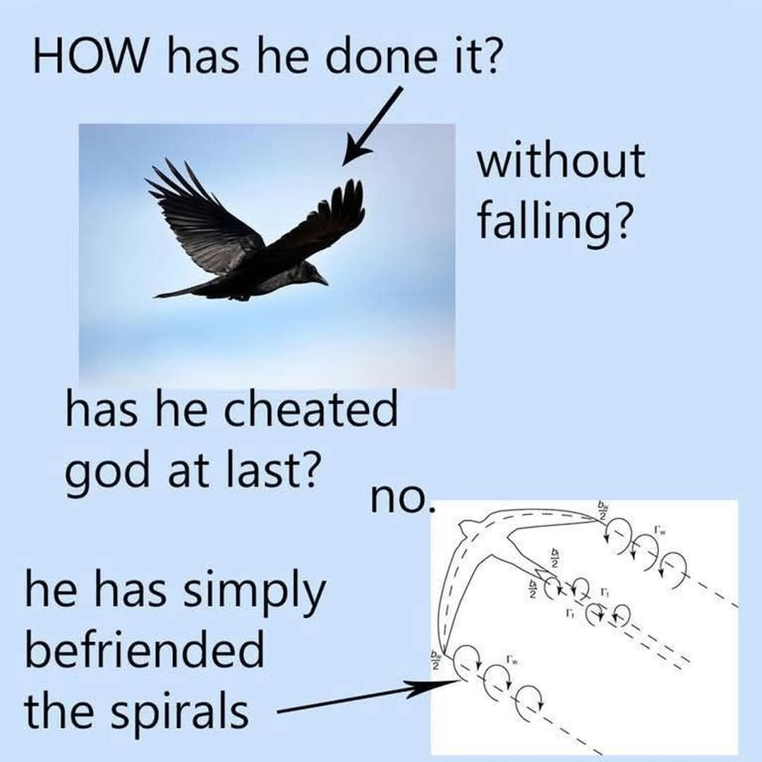 I was under the impression (from what I learned about how planes fly) that the spirals were actually a bad thing since energy was lost to turbulence via those (and hence why commercial jets have winglets on their wingtips) and the good part is the laminar flow of the air over and under the wings.