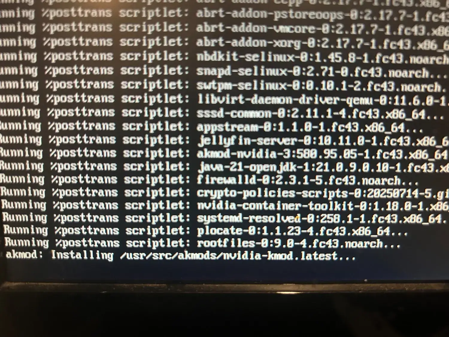 Just updated fedora server and workstation to 43. Both had nvidia cards in them. This issue came up to me too. Just force rebooting after a while fixed it for me. nvidia-smi reported thr cards and everything works.