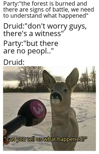 When your party doesn’t have a Cleric, but you don’t want to be a religious fruitcake to support your party, so you just roll up a Circle of the Shepherd druid and get the side bonus of being able to talk to all the beasts, all the time, no need to fw spell slots. And then take Message as a cantrip because you rolled High Elf lineage. Become the single greatest reconnaissance member your party has ever seen.