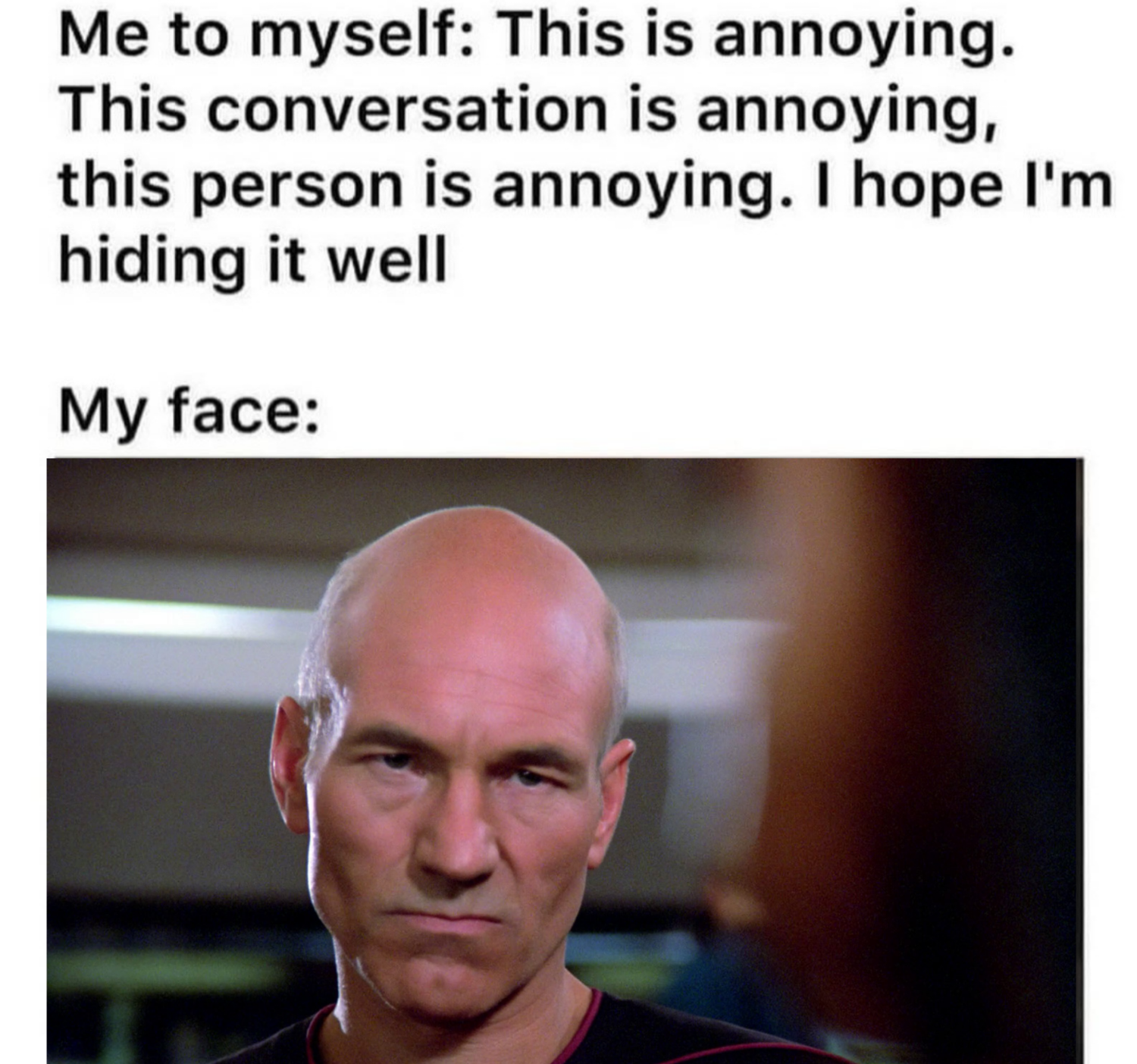minus-squareIninewCrow@lemmy.calinkfedilinkEnglisharrow-up5·edit-24 months agoMe looking at the mirror at myself while having a lengthy conversation in my head about what I need to cook for dinner tonight.