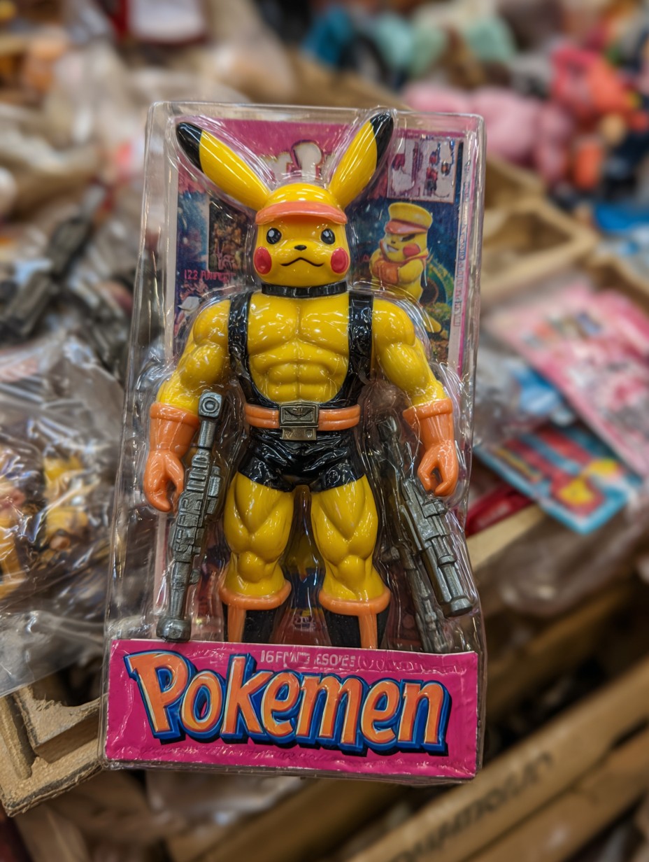Prompt: A terrible knock-off of a yellow and black rat-like look-a-like doll, with large muscles and weapon accessories, in plastic packaging, the label of the packaging reads “Pokemen” in bold letters, lying in a tray at a flea market --ar 3:4