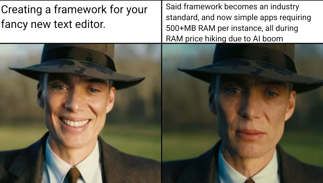 arrow-up1418arrow-down1imageElectron appslemmy.worldZILtoid1991@lemmy.world to Programmer Humor@programming.dev · 29 days agomessage-square58linkfedilink