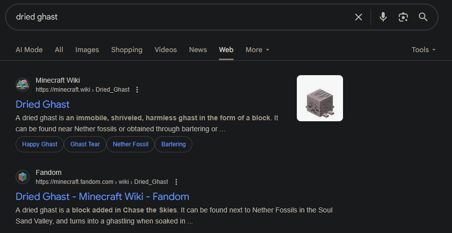 Just searched up info on dried ghasts and the dotwiki is listed above the fandom site. I don’t think I’ve seen that before.