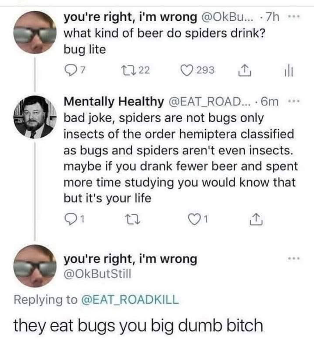 Rattling off insect classifications while a simple pun goes over you’re head is a great demonstration of the difference between knowledge and intelligence.