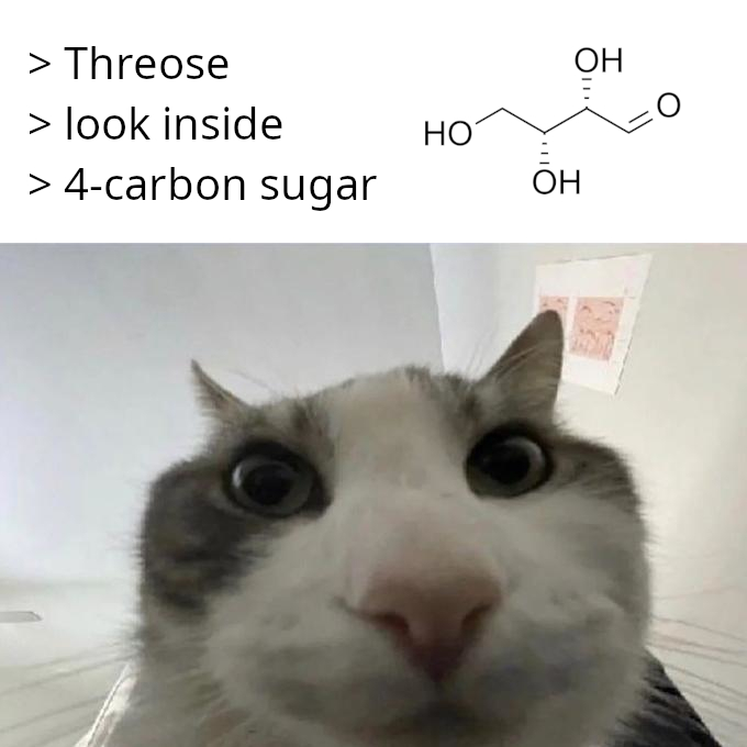 But then half a century later, a chemist called Otto Ruff discovered another compound. Same atoms as both D- and L-erythrose. Same chemical bonds: C goes to O that goes to H etc. But it was neither identical to the erythroses, nor a mirrored version of them.