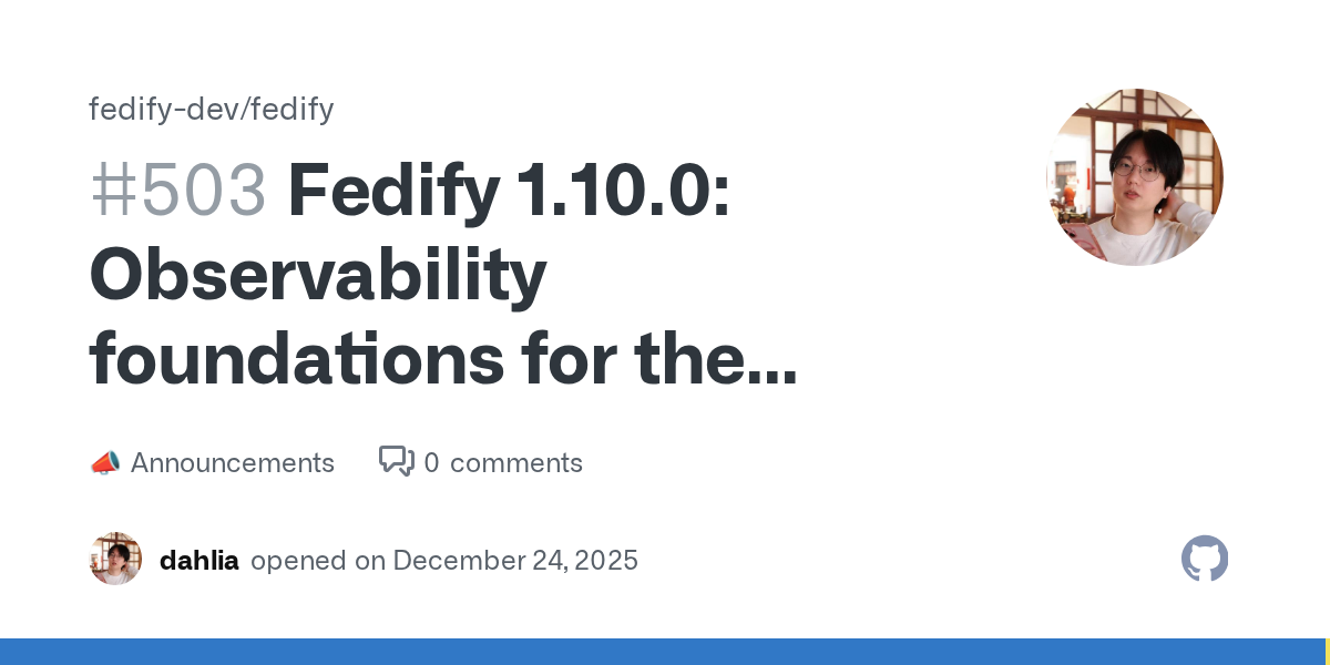 洪 民憙 (Hong Minhee)@lemmy.ml to Fediverse@lemmy.mlEnglish · 9 days agoFedify 1.10.0: Observability foundations for the future debug dashboardgithub.comexternal-linkmessage-square0linkfedilinkarrow-up16arrow-down10cross-posted to: fediverse@lemmy.world
