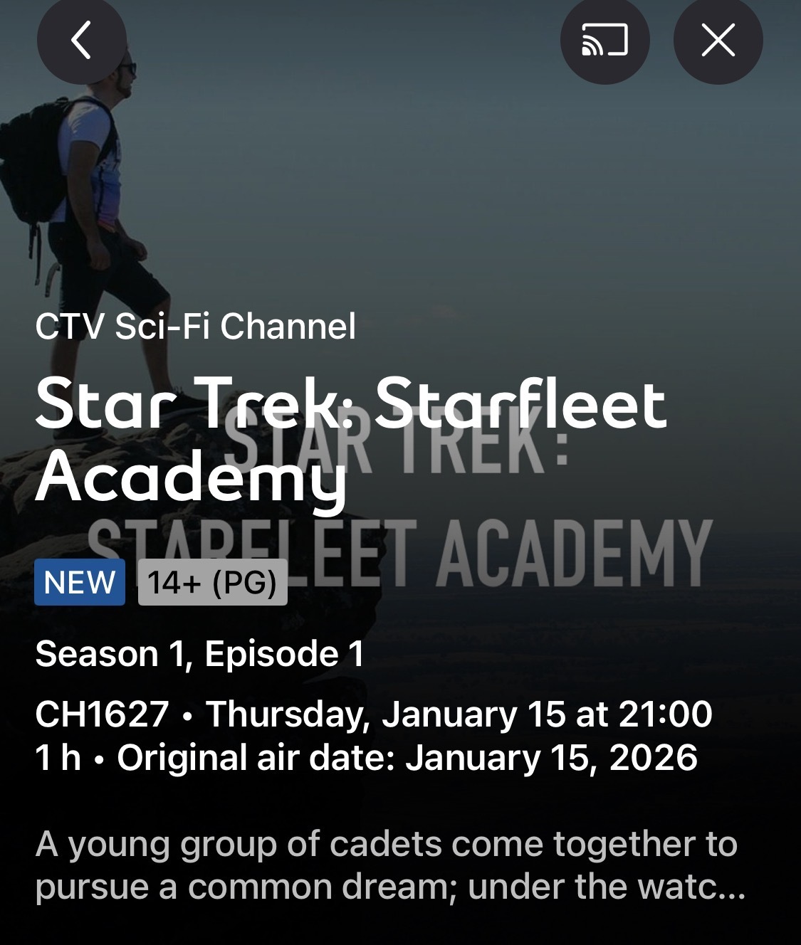 It wasn’t clear whether Starfleet Academy would also be available on CTV in first run. It’s now appearing in the television listings with a double episode premiere starting at 9:00 pm Eastern Time.