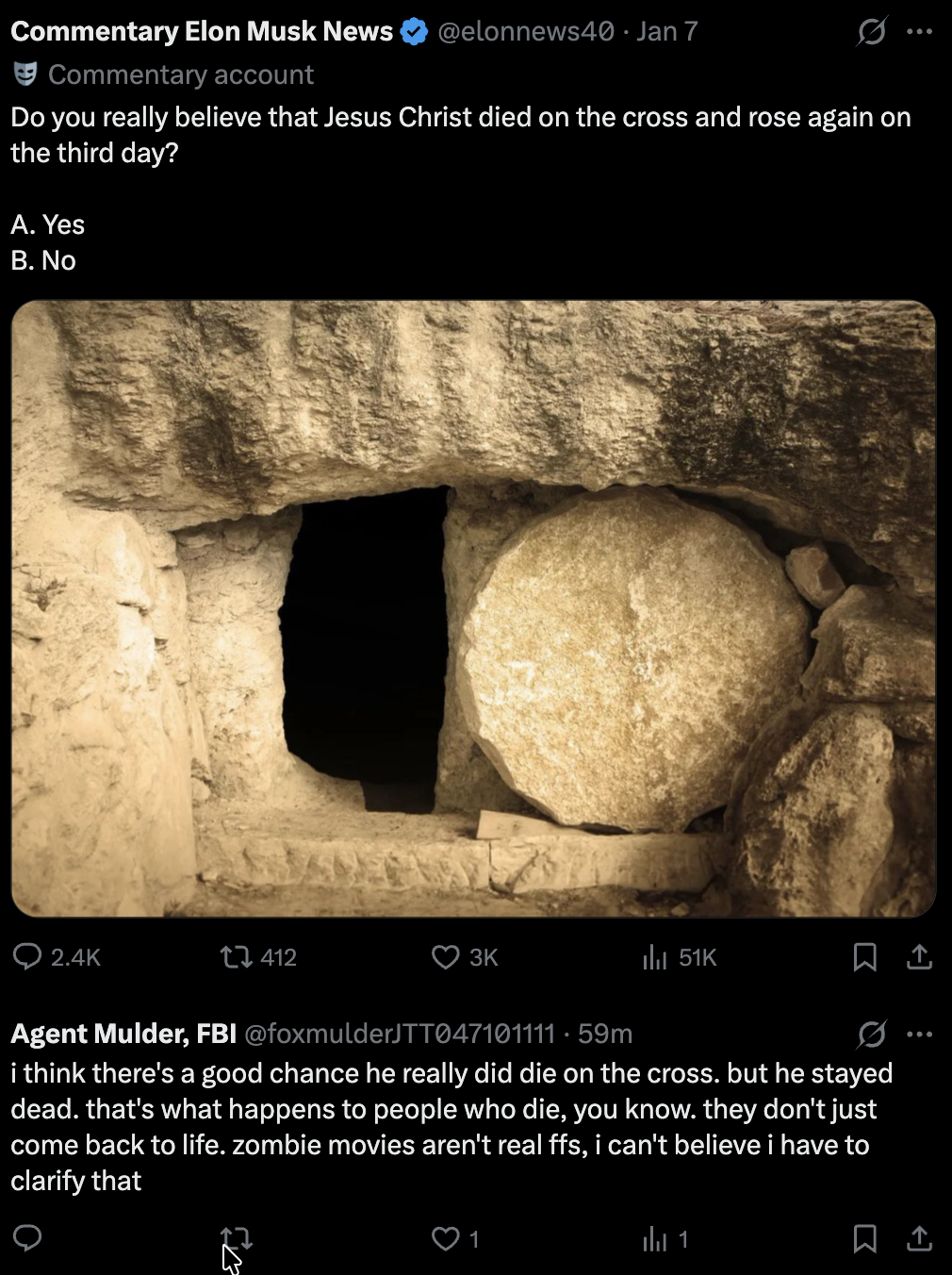 What gets me is that no one even saw him rise out of the tomb, according to the bible (as I recall it). A few days after he died, the Mary’s were just walking down the road and Jesus happened to be there going the other direction.