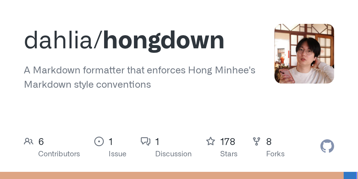 arrow-up113arrow-down1external-linkHongdown: An opinionated Markdown formatter in Rustgithub.com洪 民憙 (Hong Minhee)@lemmy.ml to Rust@programming.devEnglish · 2 months agomessage-square7linkfedilinkcross-posted to: programming@lemmy.mlprogramming@programming.dev