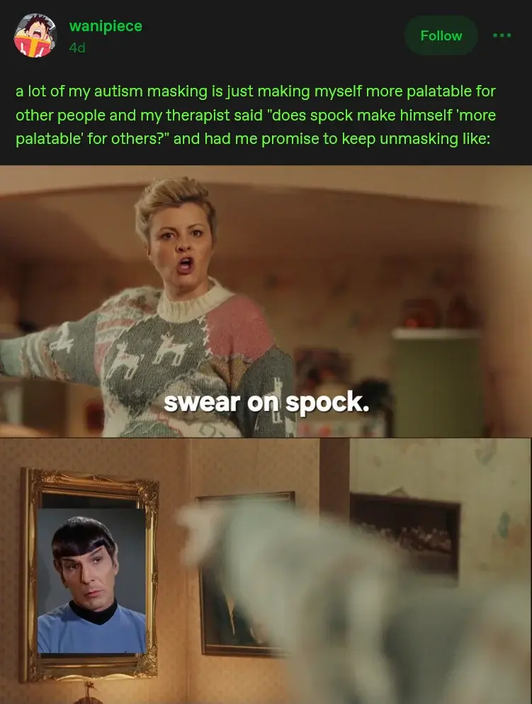 This is funny but I’m not sure how logical (🫣) it is. Is Spock autistic? He’s just…(half)Vulcan? Doing Vulcan things. Any autistic traits he demonstrates would be kind of projection wouldn’t it? That said, I understand allegory exists but I doubt this sort of thing would have been intentional by Gene Roddenberry. (I’m very fun at parties 😆)