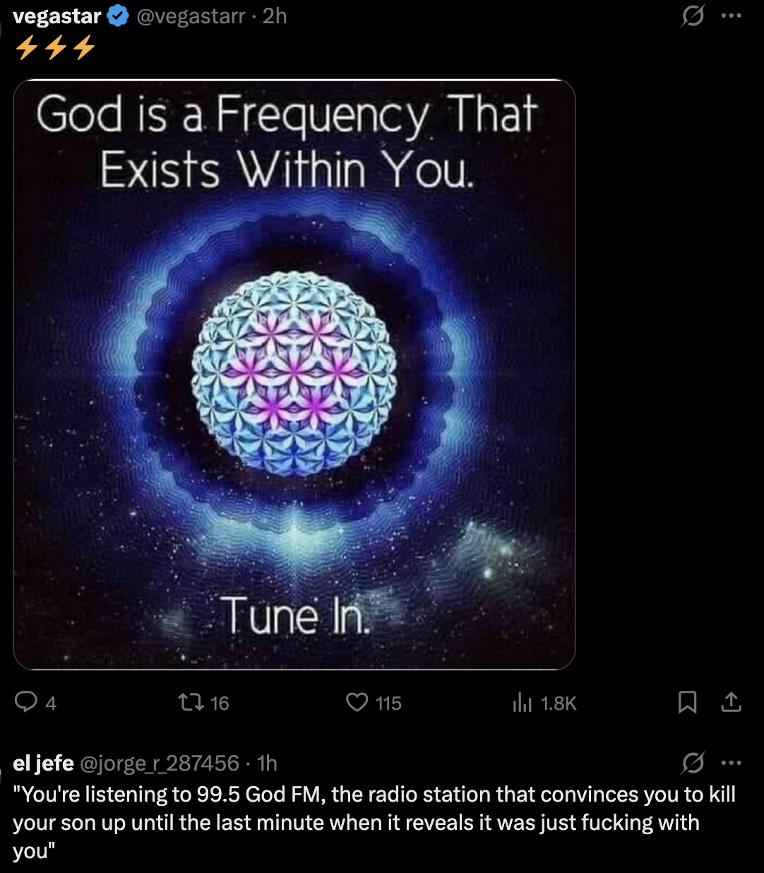there’s a paradox of omniscience worth considering. Omniscience would involve knowledge of all phenomena everywhere at all times. So the unspeakable God would be the center spoke of an infinite multiverse where every thing happens everywhere all at once. That would require the knowledge of an embodied universe where Abraham kills Isaac and also knowledge of an embodied universe where Abraham isn’t the protagonist, etc., for all paremeters within defined universe ad infinatum…