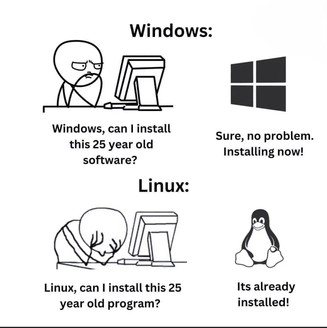 It’s funny because that’s true that an old Linux binary is likely to have issues under Linux, but an similarly old Windows application might work better under Wine on Linux than modern Windows.