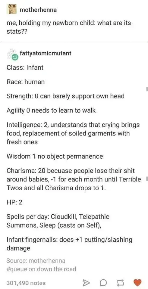 Stamets@lemmy.dbzer0.com to RPGMemes @ttrpg.network · 1 month agoSeems accurate to melemmy.dbzer0.comimagemessage-square24linkfedilinkarrow-up1422arrow-down17