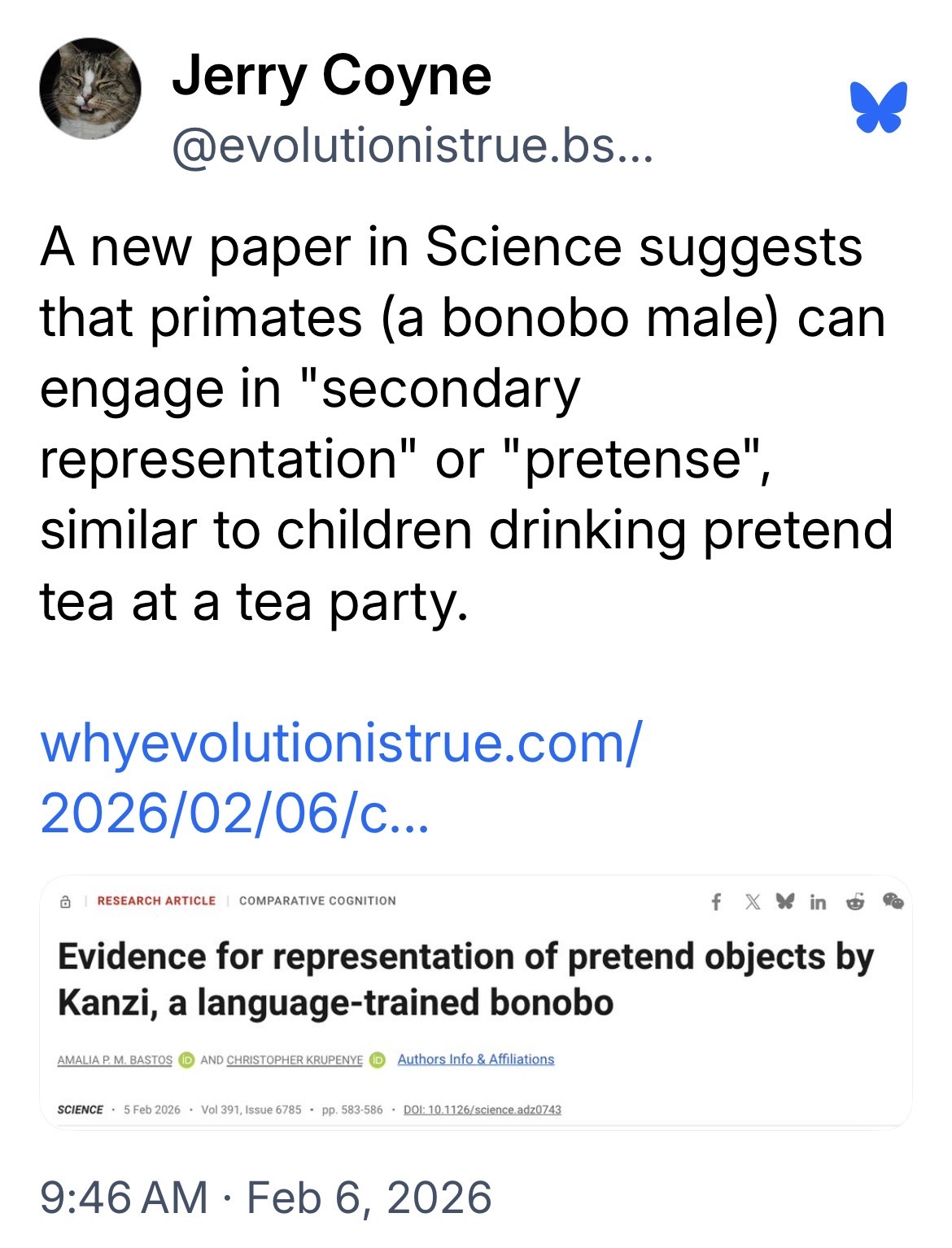 Source: https://whyevolutionistrue.com/2026/02/06/chimps-use-pretend-objects-suggesting-they-have-imagination-and-can-engage-in-pretense/