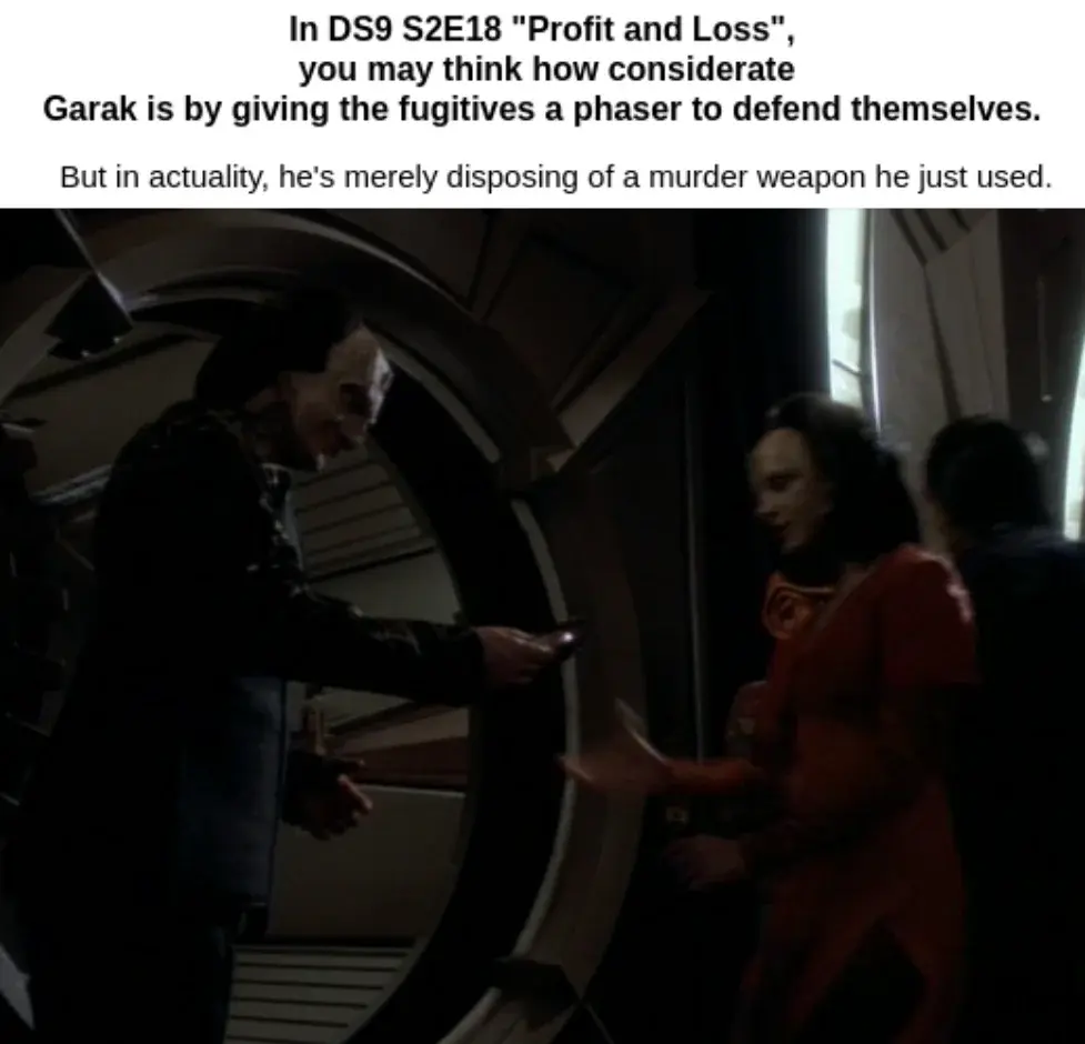 This series of posts is just pointing out things I’ve never noticed on any previous watch through. Case in point: I’ve seen this scene many times and always took it as Garak being like “It’s dangerous to go alone. Take this.”. Finally dawned on me this time around that he was just getting rid of evidence.