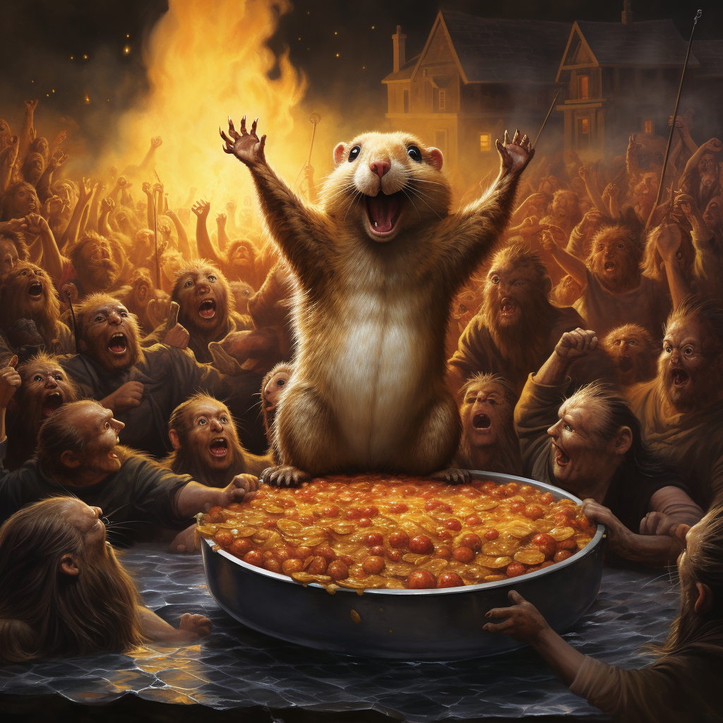 Prompt: a lemming drowning in baked beans while a crowd points and laughs