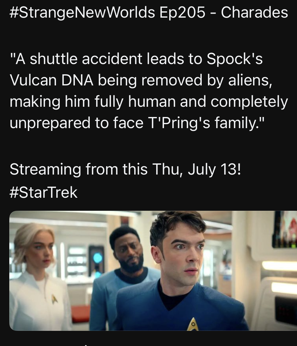 Something I’ve become increasingly concerned about with SNW is how giving Spock a series’ worth of screen time and development before his time in TOS might put him “ahead” of where he’s supposed to be in his pursuit to understand his humanity.